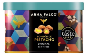 Pistacho ligeramente caramelizado recubierto de un chocolate vegetal sin lácteos que recuerda al chocolate con leche tradicional. Elaborado con horchata de chufa.