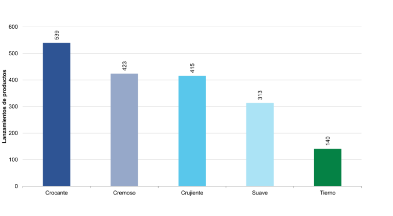 Como se observa en la gráfica, las texturas crocante y cremoso lideran los lanzamientos, reflejando la preferencia del consumidor por experiencias que combinan contraste e indulgencia. A su vez, opciones como crujiente, suave y tierno aportan variedad y permiten a las marcas jugar con diferentes sensaciones, desde lo más intenso hasta lo más delicado.